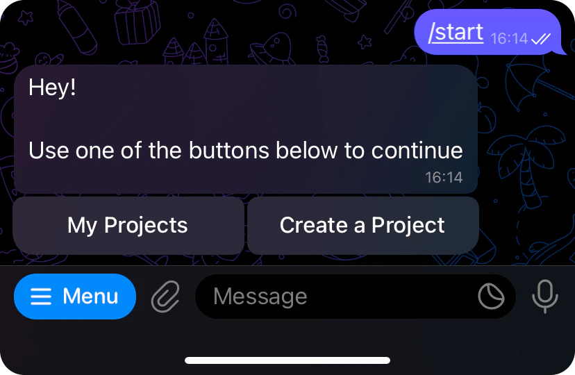 To start using the hosting functionality, you must register the project and obtain its deployment token. To get the token, go to@tma_mate_bot and press the Start button to